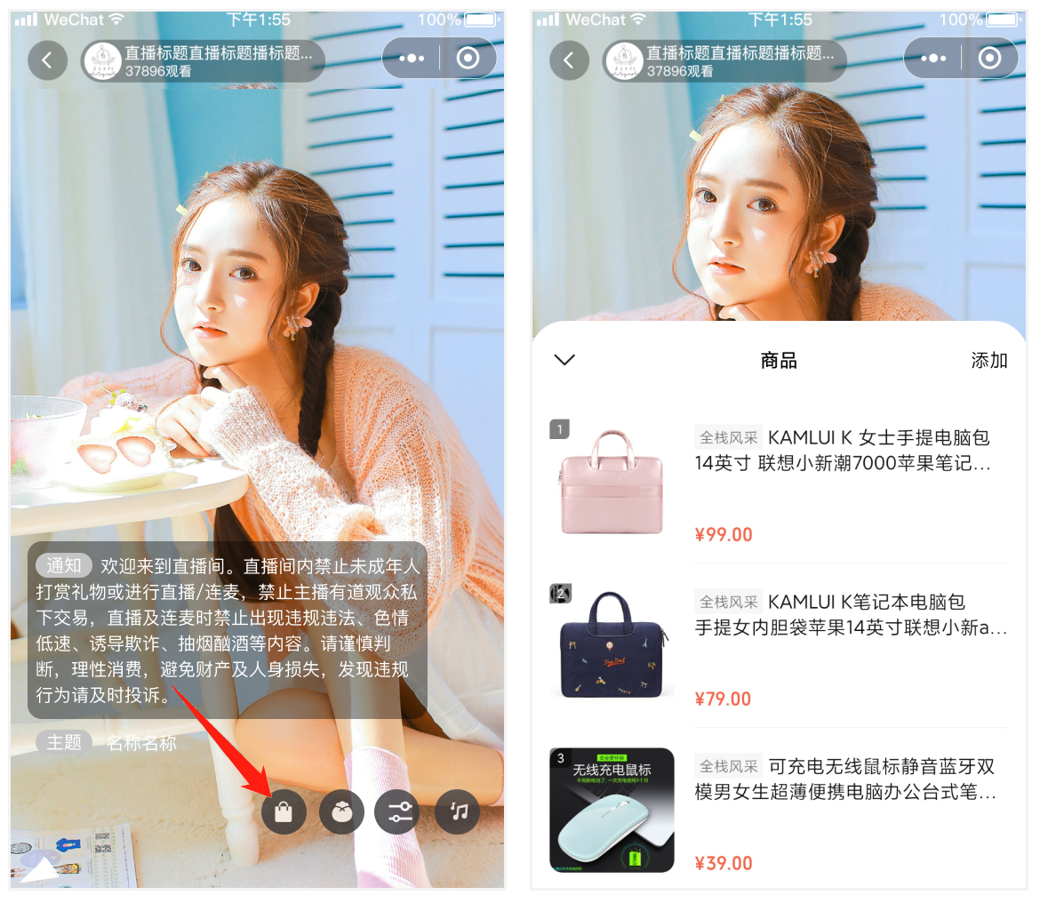 在视频号直播时,底部可挂载商家的小程序商品,用户点击购买即可直接跳转进入购买页面。