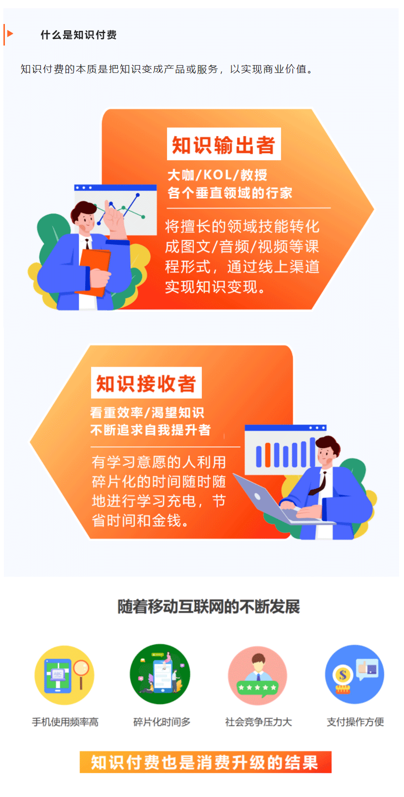 知识付费从2016年进入大众视野至今,经历了1.0的贩卖焦虑时代,到2.0的求知兴奋时代,到如今3.0的全面落地时代,知识付费在随着时代的发展不断升级。