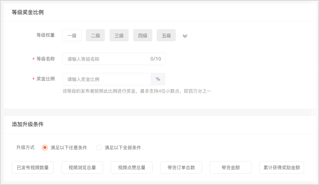 04 // 可以根据发布视频数量、视频点赞量、带货订单数、带货金额等数据灵活设置带货升级条件。