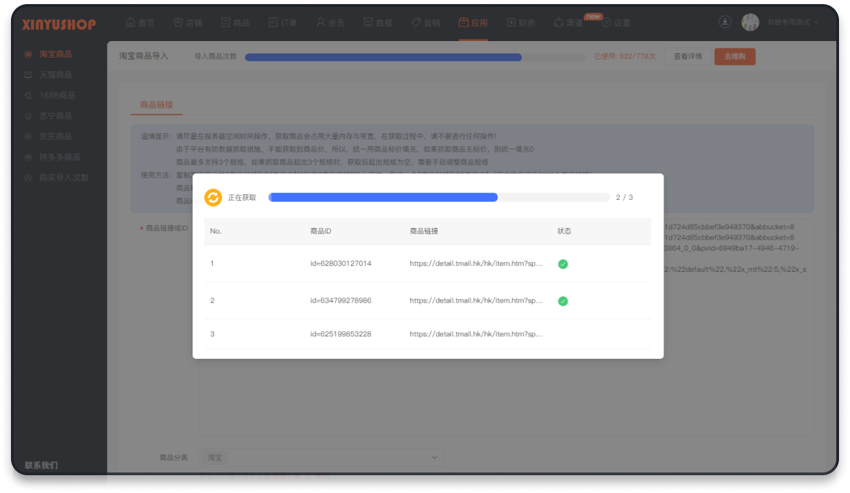 可批量导入商品信息,展示商品获取进度,获取完成后展示已成功获取商品数量和总商品数量。