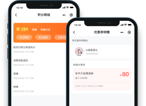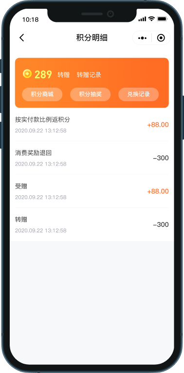 商家可根据手机号、会员昵称、姓名、时间、额度等筛选查看详细的转赠记录,方便快捷。